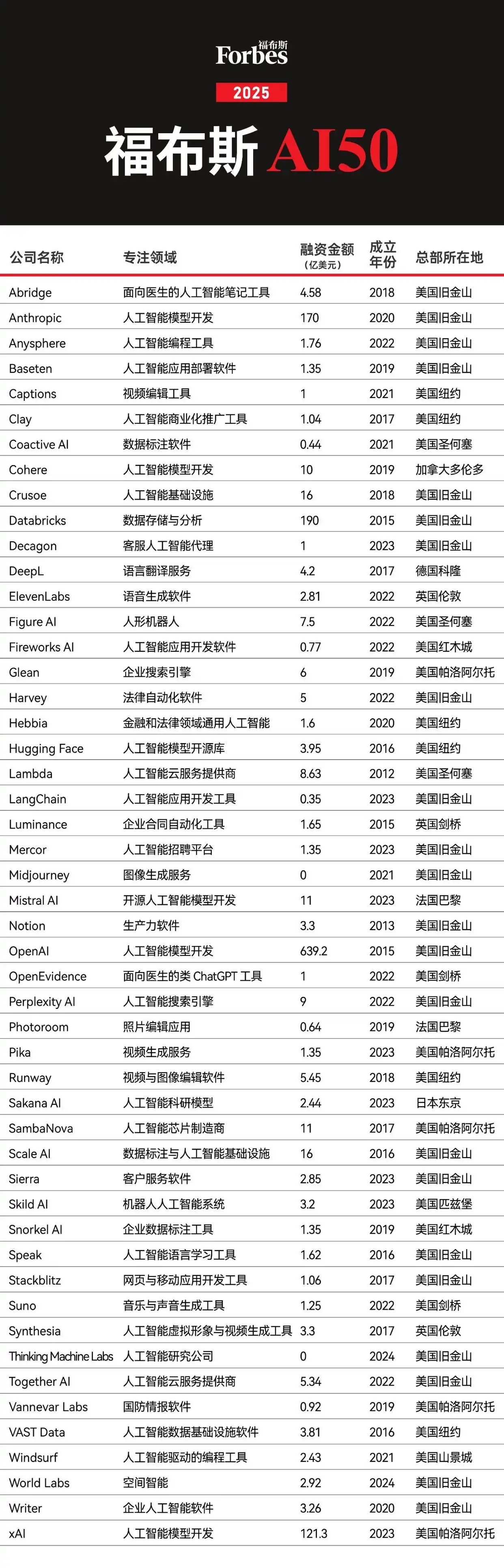 这份榜单由《福布斯》与红杉资本和Meritech Capital携手编制,聚焦全球最具潜力的非上市人工智能公司。